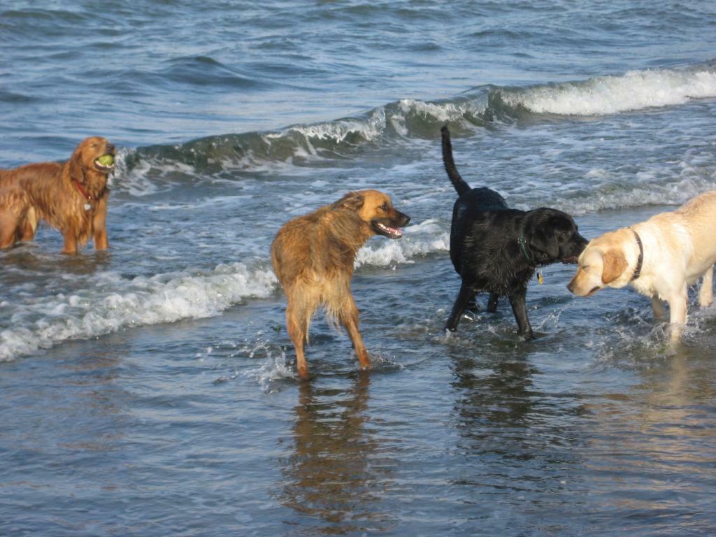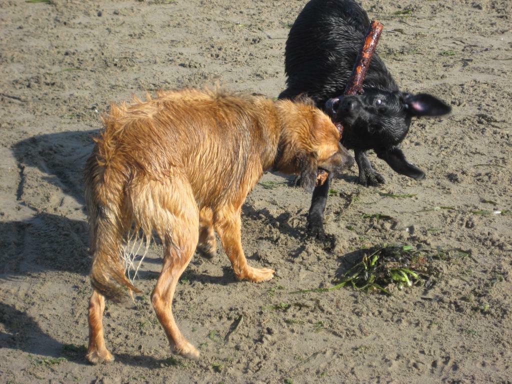 Here’s a fairly typical morning at the beach from a couple of weeks ago. Chester met a black lab puppy named Jetson, who played with him off and on for about half an hour. The yellow lab’s name is Buster.