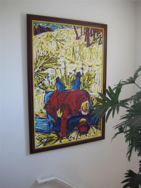 “Angels” is the title of this spectacular painting by Mark Edwin Carlson that is now hanging in the stairwell between the second and third floors. Arlin’s niece Elise gave us the painting in May when we were in Minnesota. We met the artist when we picked it up at his studio in Minneapolis. Arlin had it framed here in California. It’s so big that the stairwell is the only place it fits, but luckily the stairwell is also a great place for showing it — well lit but without direct sun on the picture, and viewable from many angles.