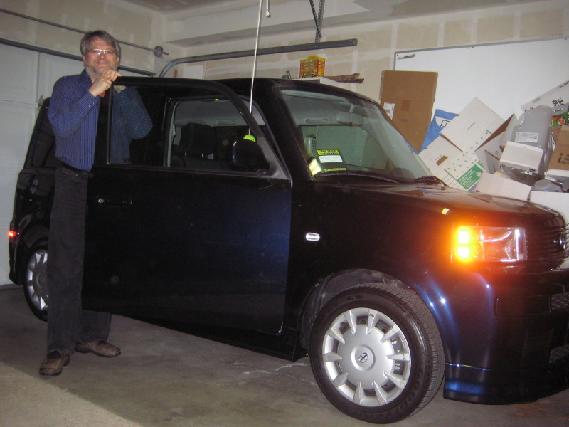 We’ve been coveting the Scion xB ever since it came out. The Hyundai’s back seat is a little cramped, and one small car is only big enough for the two of us and the two dogs. The xB has a huge back seat and is very easy to get into and out of, so Dad’s arrival was the excuse we needed to go out and buy one. It’s a 2006 with only 12,000 miles on it. Here’s Arlin just before he took it to work to show it off.