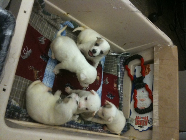 The head of my department does dog rescue work. A week before Thanksgiving she took in six new puppies whose mother had died soon after giving birth. They’re being bottle-fed in the office during the day now. The photo only shows five because one is being fed outside the crate.