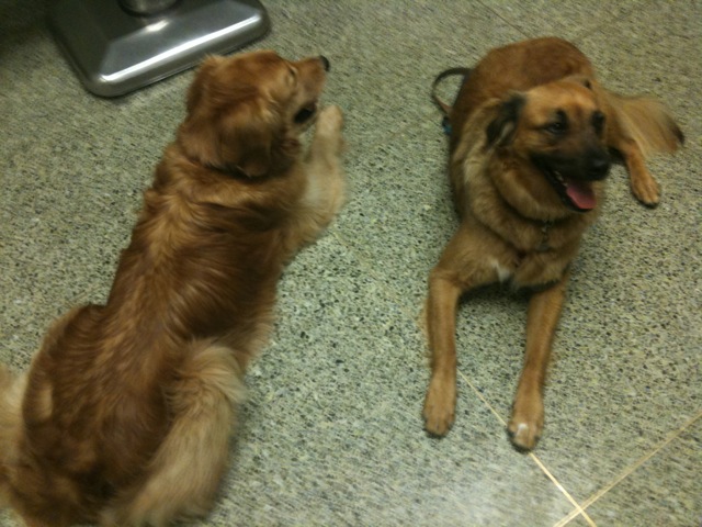 The photo shows both of them waiting in the examination room. It was an extremely busy day for the clinic. We had to wait a long time, but the students, doctors, and staff were wonderful.