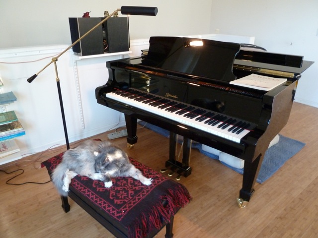 The duet bench is just wide enough for her majesty to stretch out. ruth
