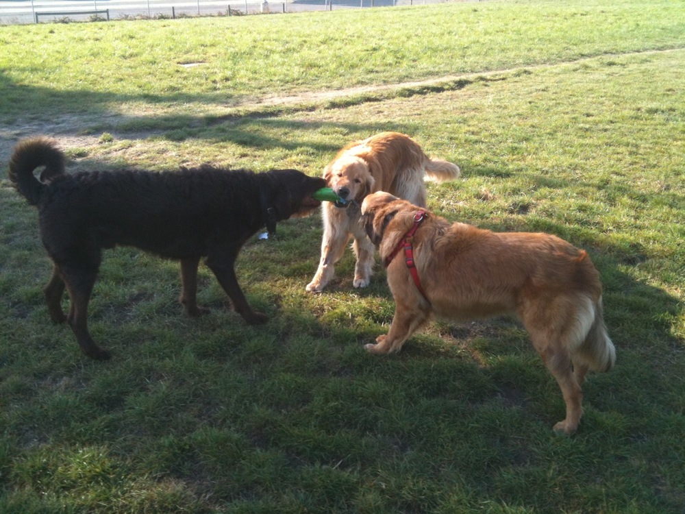 Kai was feeling well enough on Friday to participate in a three-way tug of war with Chester and our labradoodle friend Coby.
