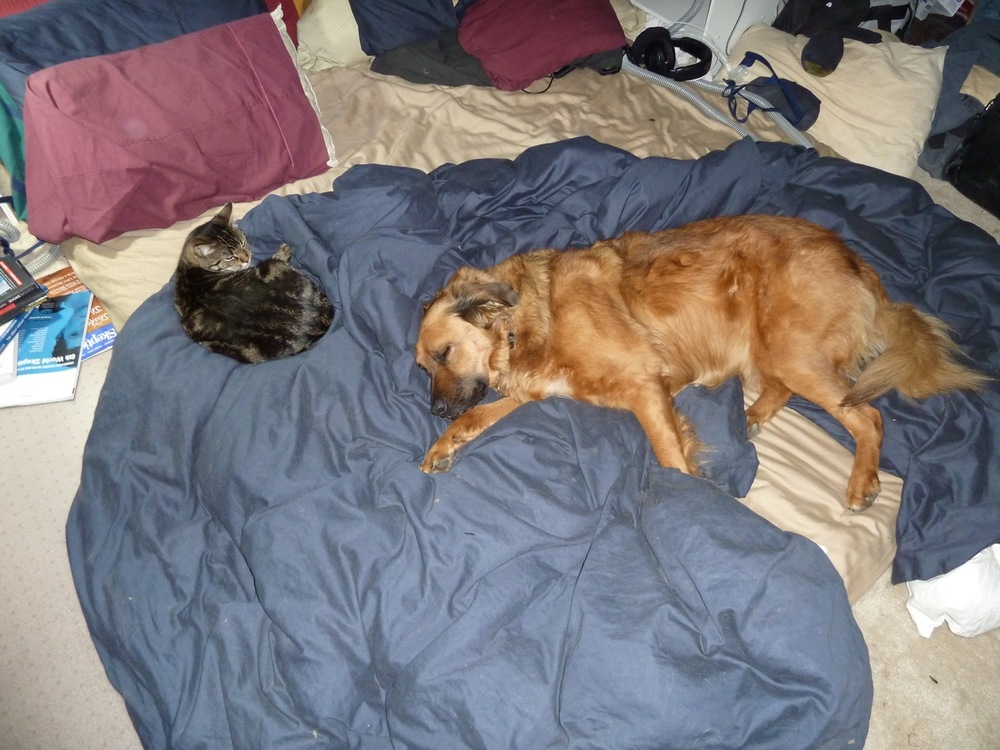 However, if he keeps his distance, everything is fine. Both Momo and Baby love to nap with us (actually, on top of us), even if the dogs are present.