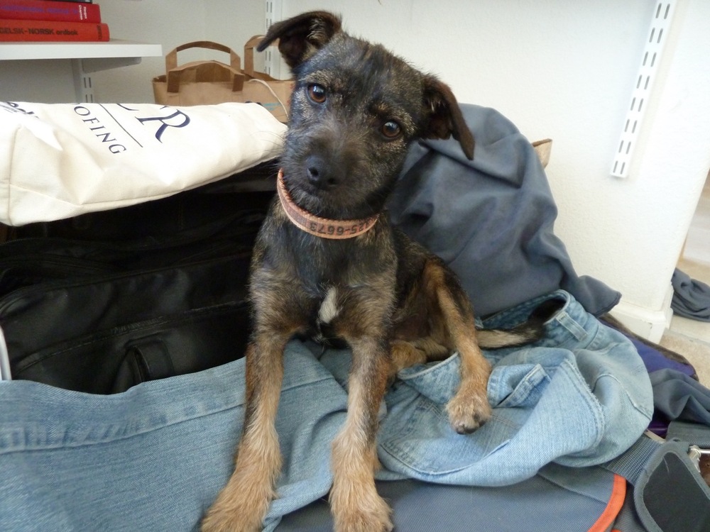 This little guy (terrier mix? 15-20 pounds? 6-9 months old?) was wandering right outside our door yesterday evening when I took Kai and Chester out at 5:00 pm. He had no collar (he’s wearing one of Chester’s old collars here). He had no chip. He did have fleas and worms, but we’re working on that. He’s a sweetheart, and he’s made himself right at home. Within an hour he was napping on Arlin’s lap.