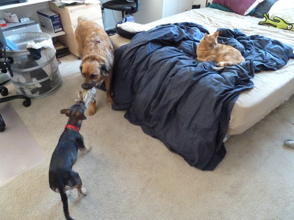 Here they’re playing tug of war on Tuesday afternoon, with Momo doing his best to ignore them.