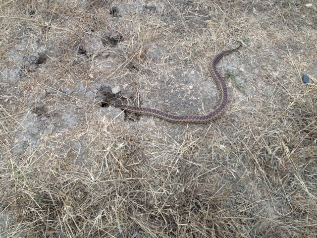 I almost trod on this handsome gopher snake at the dog park. It was lying quite still when I first saw it. As soon as I got out the phone to take a picture, it started to glide away. It was only a foot or two away from its den, so I was just able to photograph it as it slithered into its hole. I estimate that it was 2 1/2 to 3 feet long.
