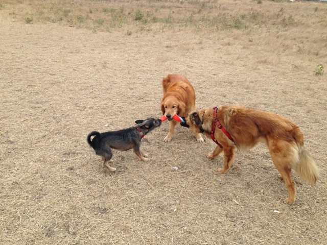 Kai turned eleven on August 3, and Chester turned six by our arbitrary reckoning. Most of the time Kai is too dignified/tired/creaky (take your pick) to join in any games now, but once in a while he can’t resist. We found a boomerang-shaped toy at the park the other day, which became the object of a three-way tug of war.