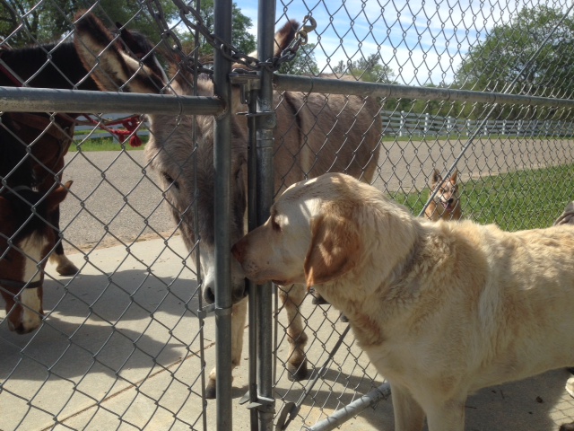 Our neighbors down the road have three horses, a donkey, and two cattle dogs, and they frequently all parade past our place. Yesterday we went out to say hello, and Callix bonded with Trona the burro. Trona is very sweet and gentle. He ignored Chester’s and Fritz’s attempts to drive him away while he communed with Callix through the gate.