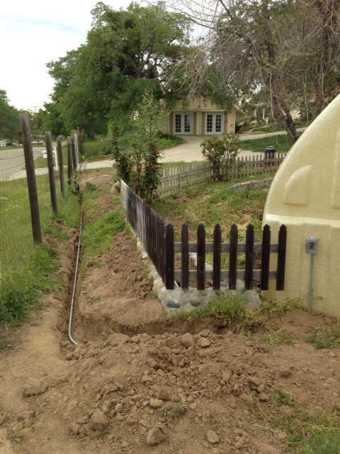 Fritz is at the left between the fence and the trench. The electric cabling will originate in the potting shed (at right), which already has power, and run to the box marked with a yellow flag.