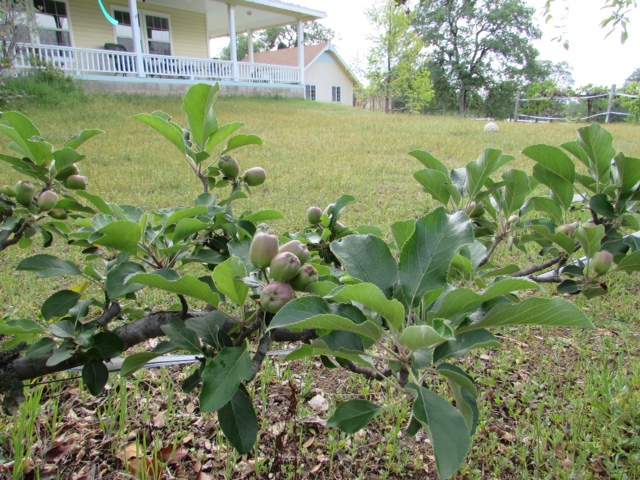 This is the tree that bloomed in January, long before any of our other trees. It’s an early blooming and early bearing variety, I find. We could have apples as early as June. Since it has to pollinate with a different variety of apple, one of our neighbors must have another early blooming apple.