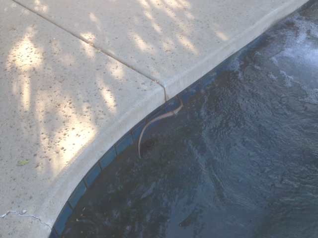 This baby gopher snake, only a foot long, was swimming in the pool yesterday evening. We fished it out and put it in the grass.
