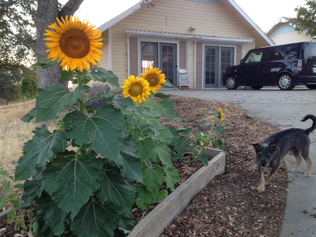 Fritz inspects Betsy’s sunflowers