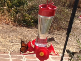 First we had a mantis on the hummingbird feeder. Now a monarch….