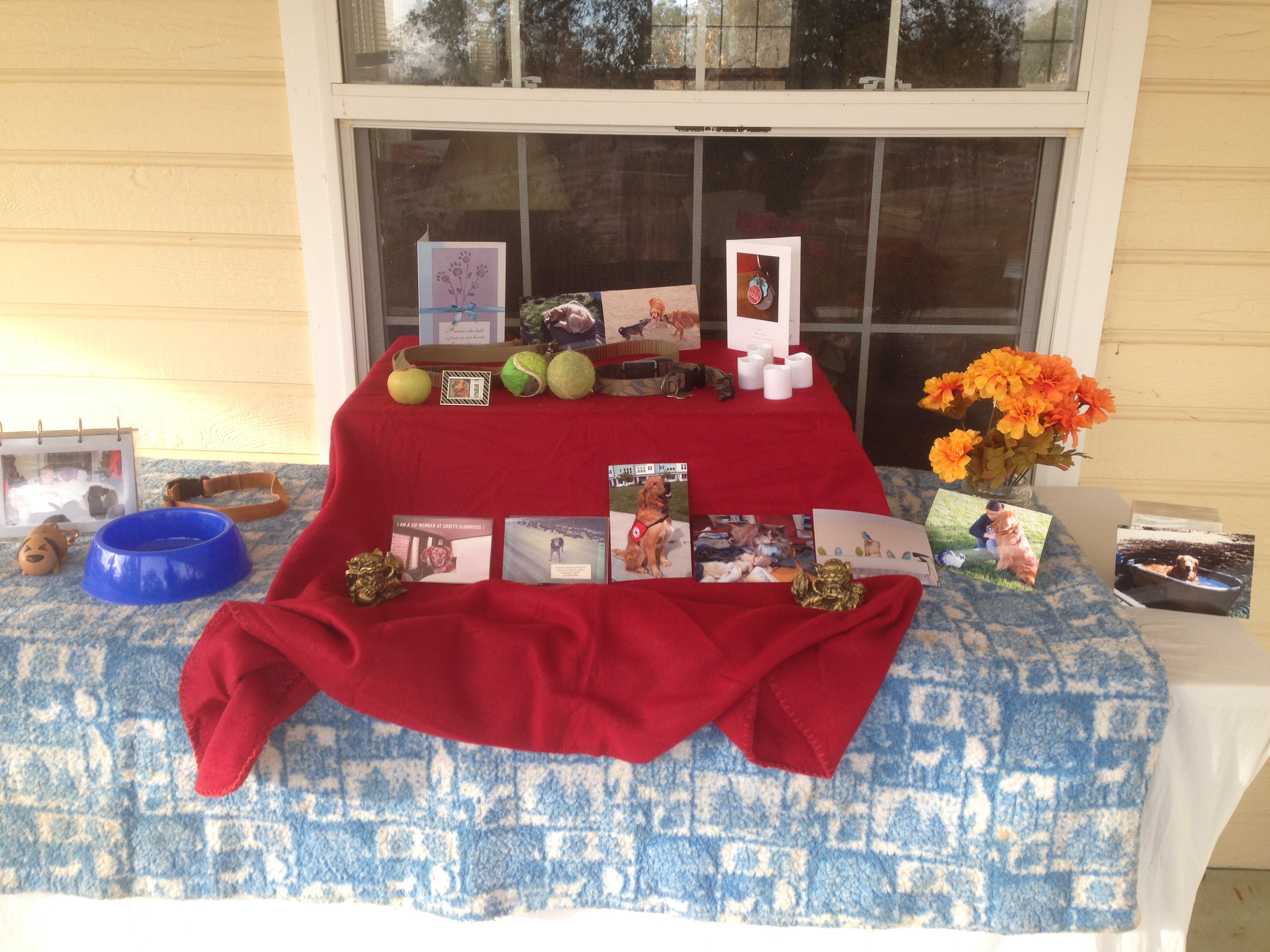 We made a Day of the Dead altar (see http://www.celebrate-day-of-the-dead.com/day-of-the-dead-altars.html) to celebrate Kai and the other animals that have been in our lives. It’s not elaborate as these things go, but it was fun to put together, and it really does help us remember all those wonderful animals who gave us so much.
