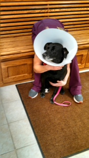 I hope Ella isn’t going to turn into another one of my $6000 free dogs. Right after I took her in to the vet for a full exam and senior blood screen last Saturday (ka-ching, ka-ching) because she is an 8 year old puppy with a one page medical history, she started worrying her rear right foot and performing an occasional limp/skip. So yesterday, back to the vet. She had somehow managed to stab or slice the upper inner webbing of her paw pad, probably while playing chase with Chester. I thought his initiating play meant he was beginning to accept her to the family, but maybe his running her around like maniacs had a less benign motivation? After all, Chester has been walking around muttering “alright, she’s been here a week, isn’t it time she went home? o.k., she’s been here two weeks now, isn’t it time she went home?” Anyway, the poor girl is in a cone with a wrapped paw now for three days. She is not amused!