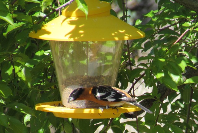 This Black-headed Grosbeak has been hanging around our feeder and birdbath for the last few days. According to my sources, they migrate here to breed in late April/early May, so I wouldn’t be surprised if there’s a female and a nest around somewhere–but we haven’t seen them.