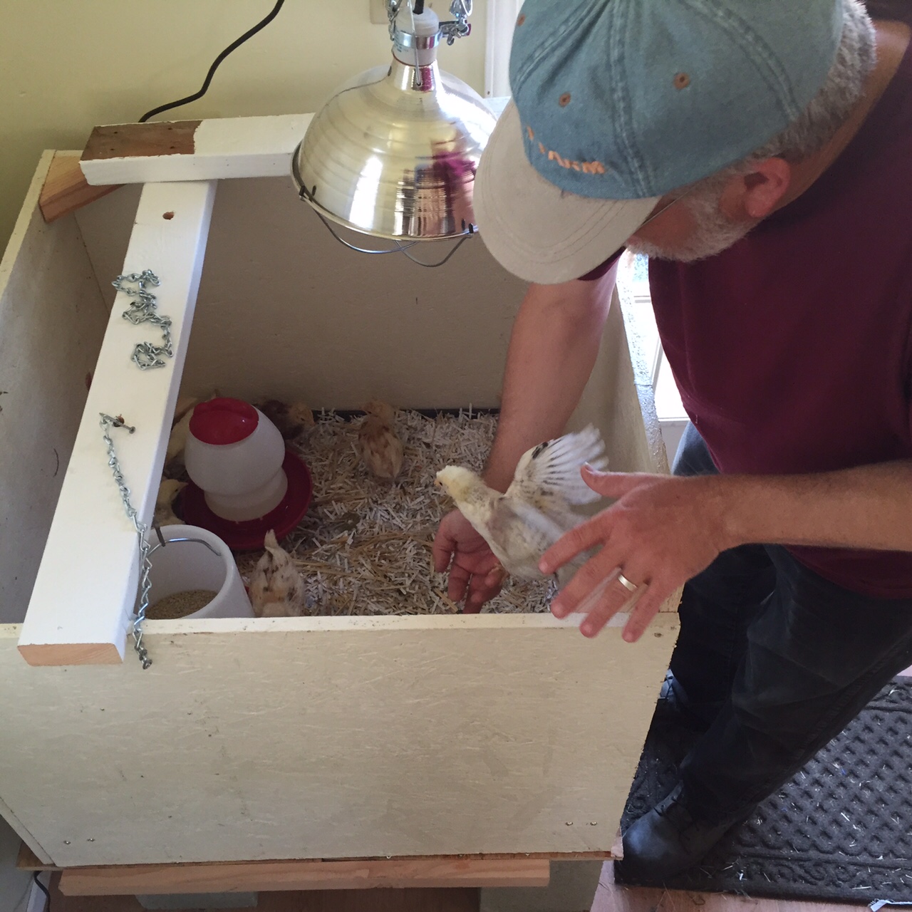We went to the feed store Saturday and Arlin bought eight chicks. He had already built this beautiful brooding pen. Now the chicks are comfortably housed in the firehouse, waiting to get big enough to move to the coop. That won’t take long, since they’re already four weeks old. Another two weeks should do it.