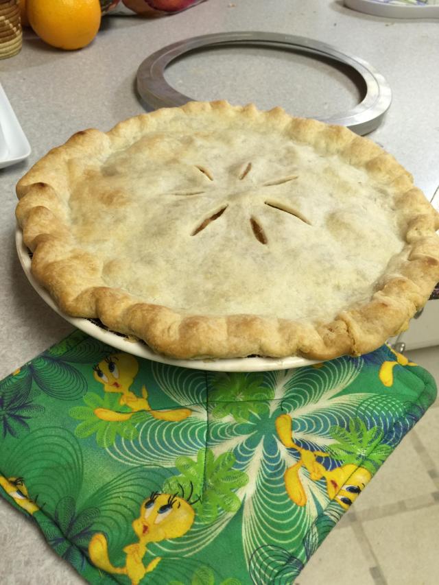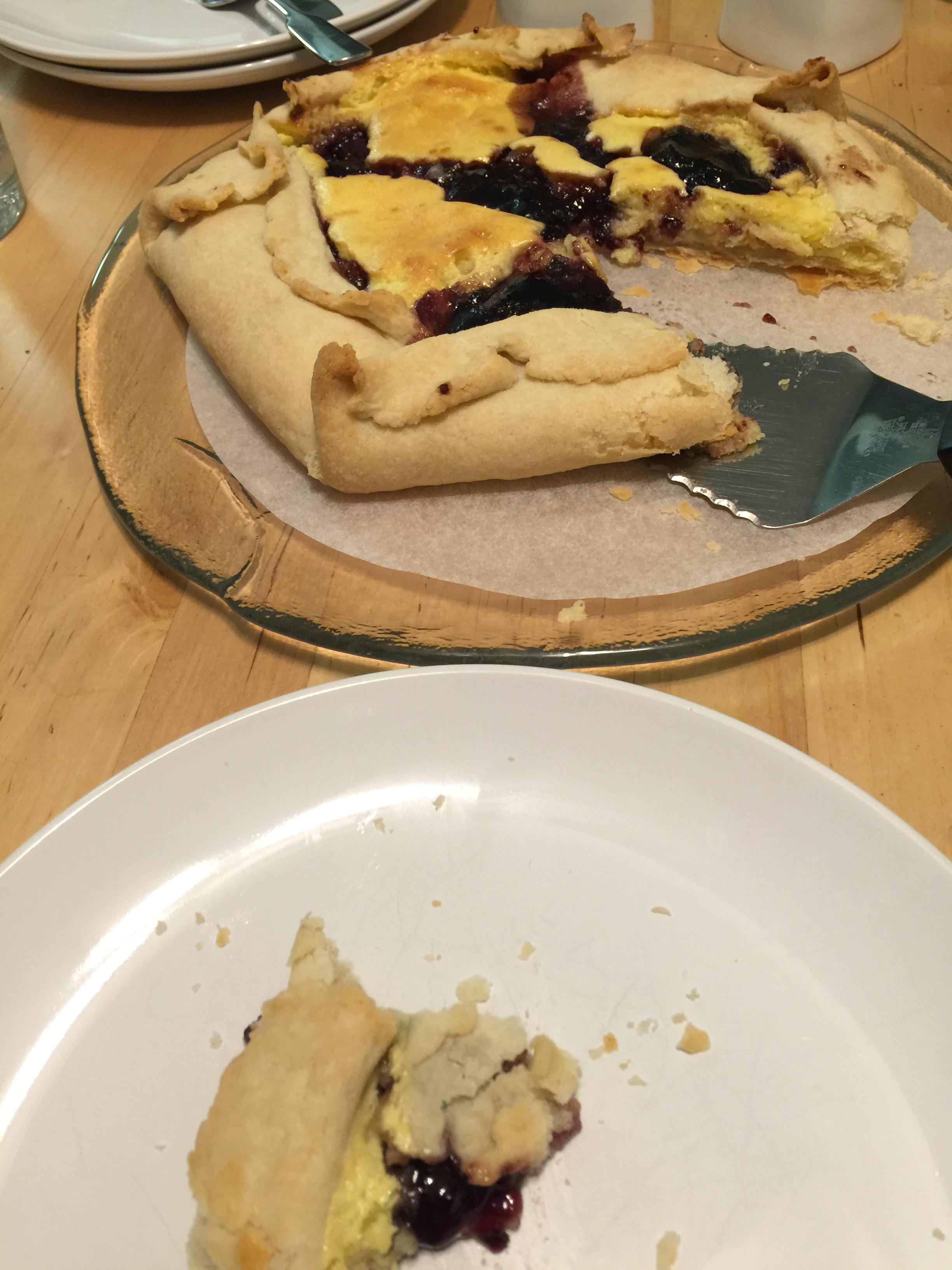 Was hankerin’ for a bit of apple pie. But the pastry recipe made 3 crusts. What can one do but make two desserts? Filled with some cream cheese, an egg, a bit of sugar; topped with some blueberry preserves; folded up galette-style. Worked out nicely!