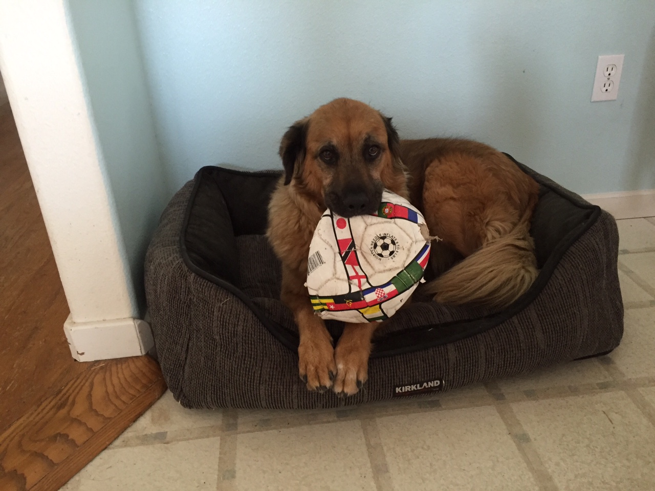 Chester’s favorite toy — the deflated soccer ball