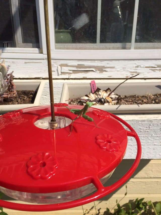 This is the fifth day in a row that the mantis has been hanging around the hummingbird feeders. I have to move it every time I fill them, and it always comes back. The hummingbirds don’t like it — they won’t drink from the feeder it’s sitting on — so it’s good that we have several feeders. We may have to relocate it ourselves if it doesn’t go away soon.