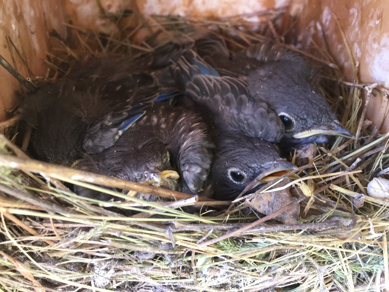 This photo (from Monday afternoon) is the last that I’ll get from inside the nest. Bluebirds are ready to explore outside the nest 3 weeks after hatching, so I expect to see the oldest chicks peeking out of the nest box in a few days. It’s unwise to disturb them during this period, so I’ll just be watching from outside the box.