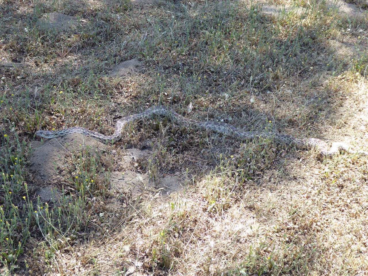 A magnificent gopher snake was lying next to the path to the mailbox around 11:00 this morning. Adults reach 4.5 to 5 feet in length. This guy was at least 4 feet. We put the dogs inside and I came back to get the photo.
