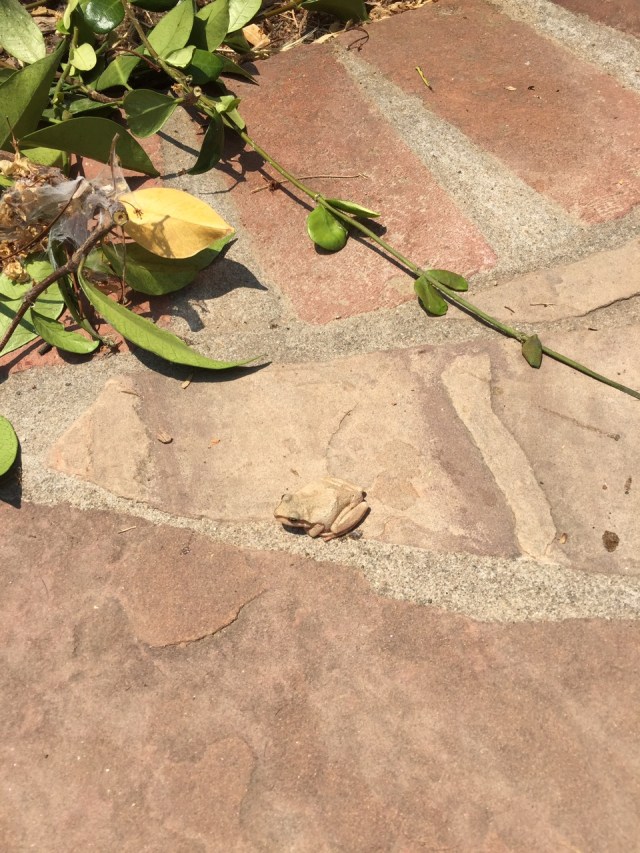 This tiny frog hitched a ride to Fresno and back two days ago by hiding out in our insulated bag when I went to Costco. I discovered it when I was putting milk and butter in the bag to go home. I packed them carefully so as not to hurt it, and it hopped out when I got back, apparently none the worse for the trip.