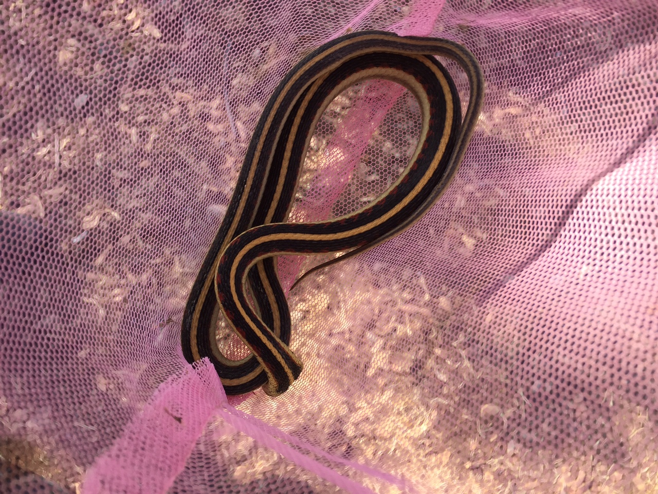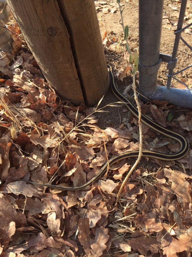 I rescued Betsy from this garter snake — or maybe I rescued the garter snake from Betsy. Anyway, it was under the sink in the craft house. I got it into a net and let it go out the gate before the dogs got too interested.