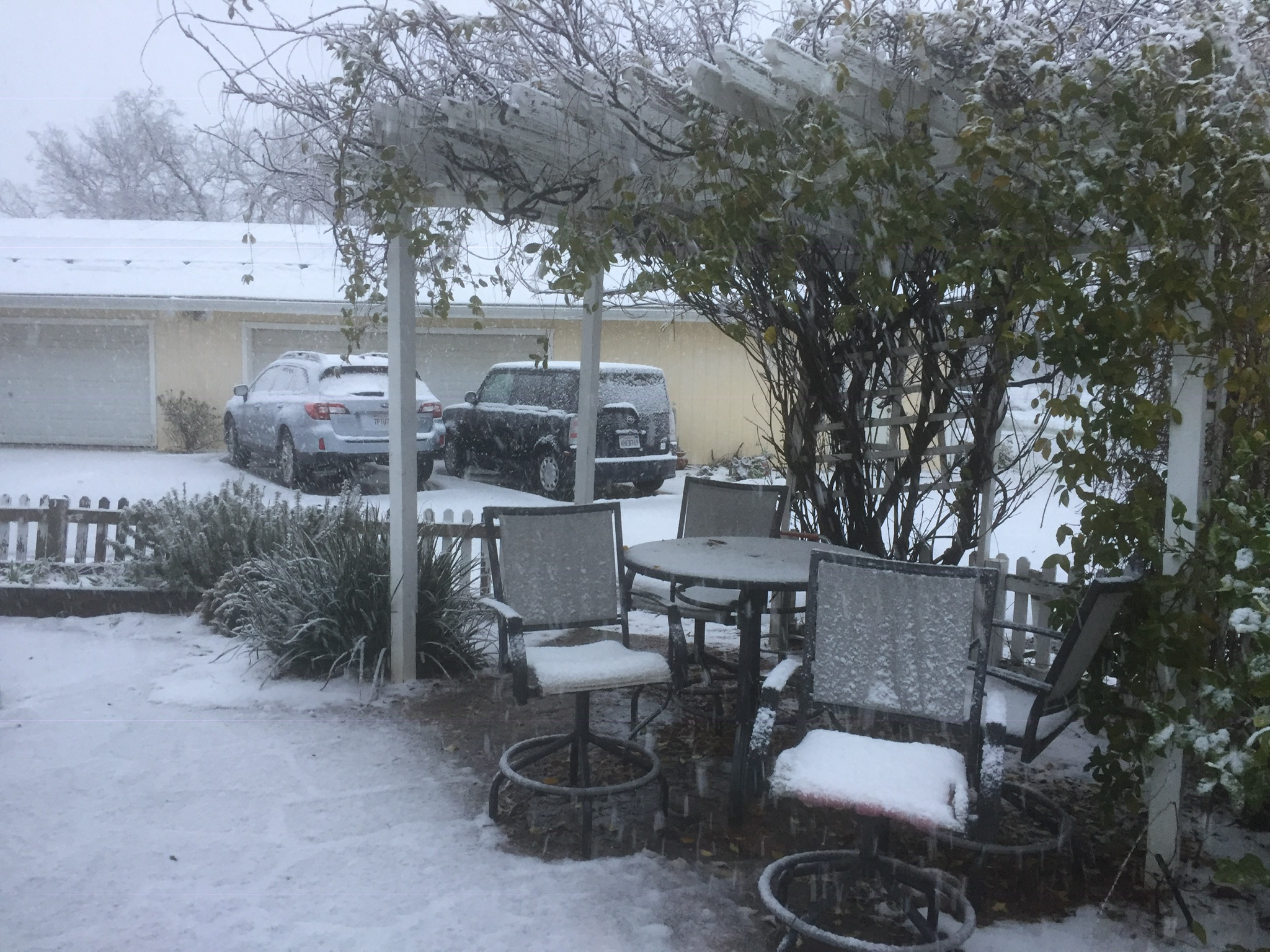Snow started ten minutes ago (about 7:10 am). We paid for this with two extended power outages between 7:00 pm Sunday and 9:00 pm Monday.