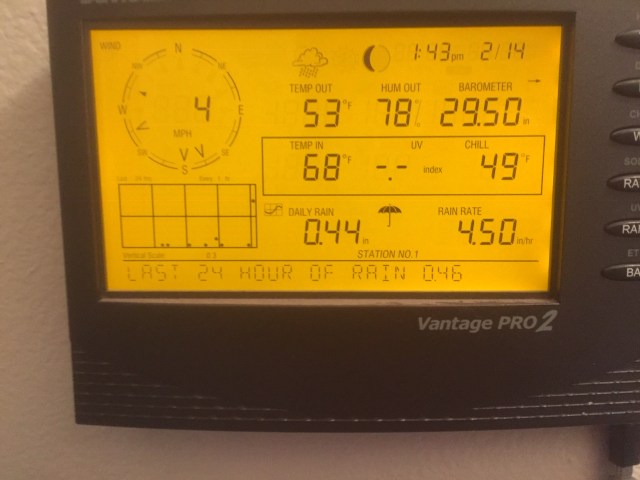 We’ve had another couple of days of wild, wild weather. On Valentine’s Day we had hail (again) and thunder. At one point the rain was coming down at a rate of almost 5 inches an hour. Luckily that only lasted a couple of minutes.